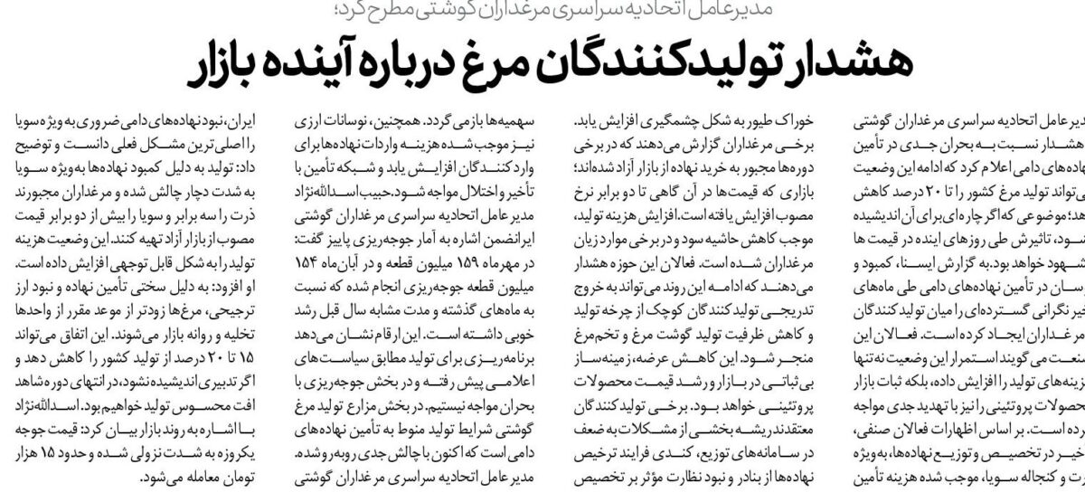 مدیرعامل اتحادیه سراسری مرغداران گوشتی با هشدار نسبت به بحران جدی در تأمین نهادههای دامی اعلام کرد که ادامه این وضعیت میتواند تولید مرغ کشور را تا ۲۰ درصد کاهش دهد؛ موضوعی که اگر چاره ای برای آن اندیشیده نشود، تاثیرش طی روزهای اینده در قیمت ها مشهود خواهد بود.به گزارش ایسنا، کمبود و نوسان در تأمین نهادههای دامی طی ماههای اخیر نگرانی گستردهای را میان تولیدکنندگان و مرغداران ایجاد کرده است. فعالان این صنعت میگویند استمرار این وضعیت نهتنها هزینههای تولید را افزایش داده، بلکه ثبات بازار محصولات پروتئینی را نیز با تهدید جدی مواجه کرده است. بر اساس اظهارات فعالان صنفی، تأخیر در تخصیص و توزیع نهادهها، بهویژه ذرت و کنجاله سویا، موجب شده هزینه تأمین خوراک طیور به شکل چشمگیری افزایش یابد. برخی مرغداران گزارش میدهند که در برخی دورهها مجبور به خرید نهاده از بازار آزاد شدهاند؛ بازاری که قیمتها در آن گاهی تا دو برابر نرخ مصوب افزایش یافته است.افزایش هزینه تولید، موجب کاهش حاشیه سود و در برخی موارد زیان مرغداران شده است. فعالان این حوزه هشدار میدهند که ادامه این روند میتواند به خروج تدریجی تولیدکنندگان کوچک از چرخه تولید و کاهش ظرفیت تولید گوشت مرغ و تخممرغ منجر شود. این کاهش عرضه، زمینهساز بیثباتی در بازار و رشد قیمت محصولات پروتئینی خواهد بود. برخی تولیدکنندگان معتقدند ریشه بخشی از مشکلات به ضعف در سامانههای توزیع، کندی فرایند ترخیص نهادهها از بنادر و نبود نظارت مؤثر بر تخصیص سهمیهها بازمیگردد. همچنین، نوسانات ارزی نیز موجب شده هزینه واردات نهادهها برای واردکنندگان افزایش یابد و شبکه تأمین با تأخیر و اختلال مواجه شود.حبیب اسداللهنژاد مدیرعامل اتحادیه سراسری مرغداران گوشتی ایرانضمن اشاره به آمار جوجهریزی پاییز گفت: در مهرماه ۱۵۹ میلیون قطعه و در آبانماه ۱۵۴ میلیون قطعه جوجهریزی انجام شده که نسبت به ماههای گذشته و مدت مشابه سال قبل رشد خوبی داشته است. این ارقام نشان میدهد برنامهریزی برای تولید مطابق سیاستهای اعلامی پیش رفته و در بخش جوجهریزی با بحران مواجه نیستیم. در بخش مزارع تولید مرغ گوشتی شرایط تولید منوط به تأمین نهادههای دامی است که اکنون با چالش جدی روبهرو شده. مدیرعامل اتحادیه سراسری مرغداران گوشتی ایران، نبود نهادههای دامی ضروری به ویژه سویا را اصلیترین مشکل فعلی دانست و توضیح داد: تولید به دلیل کمبود نهادهها بهویژه سویا به شدت دچار چالش شده و مرغداران مجبورند ذرت را سه برابر و سویا را بیش از دو برابر قیمت مصوب از بازار آزاد تهیه کنند. این وضعیت هزینه تولید را به شکل قابل توجهی افزایش داده است.او افزود: به دلیل سختی تأمین نهاده و نبود ارز ترجیحی، مرغها زودتر از موعد مقرر از واحدها تخلیه و روانه بازار میشوند. این اتفاق میتواند ۱۵ تا ۲۰ درصد از تولید کشور را کاهش دهد و اگر تدبیری اندیشیده نشود، در انتهای دوره شاهد افت محسوس تولید خواهیم بود. اسداللهنژاد با اشاره به روند بازار بیان کرد: قیمت جوجه یکروزه به شدت نزولی شده و حدود ۱۵ هزار تومان معامله میشود.