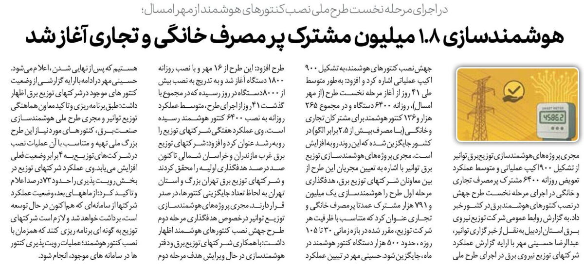 مجری پروژههای هوشمندسازی توزیعبرق توانیر از تشکیل ۹۰۰ اکیپ عملیاتی و متوسط عملکرد تعویض روزانه ۶۴۰۰ مشترک پرمصرف تجاری و خانگی در اجرای مرحله نخست طرح جهش در نصب کنتورهای هوشمند برق در کشور خبر داد. به گزارش روابط عمومی شرکت توزیع نیروی برق استان اردبیل به نقل از خبرگزاری توانیر، عبدالرضا حسینی مهر با ارایه گزارش عملکرد شرکتهای توزیع نیروی برق در اجرای طرح ملی جهش نصب کنتورهای هوشمند، به تشکیل ۹۰۰ اکیپ عملیاتی اشاره کرد و افزود: بهطور متوسط طی ۴۱ روز از آغاز مرحله نخست طرح (از مهر امسال)، روزانه ۶۴۰۰ دستگاه و در مجموع ۲۶۵ هزار و ۱۳۶ کنتور هوشمند برای مشترکان تجاری و خانگی (با مصرف بیش از ۲.۵ برابر الگو) در کشور جایگزین شده که این روند رو به افزایش است. مجری پروژههای هوشمندسازی توزیع برق توانیر با اشاره به تعیین مجریان این طرح از بین معاونان شرکتهای توزیع برق، هدفگذاری مرحله اول طرح را هوشمندسازی یک میلیون و ۷۹۱ هزار مشترک عمدتا پرمصرف خانگی و تجاری عنوان کرد که متناسب با ظرفیت هر شرکت توزیع، مقرر شده در بازه زمانی ۳۰ تا ۱۰۵ روزه ، حدود ۵۰۰ هزار دستگاه کنتور هوشمند در ماه ، جایگزین شود. حسینی مهر در تبیین عملکرد طرح افزود: این طرح از ۱۶ مهر و با نصب روزانه ۱۸۰۰ دستگاه آغاز شد و به تدریج به نصب بیش از ۸۰۰۰ دستگاه در روز رسیده که در مجموع با گذشت ۴۱ روز از اجرای طرح ، متوسط عملکرد روزانه به نصب ۶۴۰۰ کنتور هوشمند رسیده است. وی عملکرد هفتگی شرکتهای توزیع را رو به رشد عنوان کرد و افزود: شرکتهای توزیع برق غرب مازندران و خراسان شمالی تاکنون صد درصد هدفگذاری اولیه را محقق کردند و شرکتهای توزیع برق تهران بزرگ و استان تهران به لحاظ تعداد جایگزینی کنتورها، در صدر قرار دارند. مجری پروژههای هوشمندسازی توزیع توانیر درخصوص هدفگذاری مرحله دوم طرح جهش نصب کنتورهای هوشمند اظهار داشت: با همکاری شرکتهای توزیع برق و دفتر هوشمندسازی در حال ویرایش هدف مرحله دوم هستیم که پس از نهایی شدن ، اعلام میشود.حسینی مهر در ادامه با ارایه گزارشی از وضعیت کنتور های موجود درشرکتهای توزیع برق اظهار داشت: طبق برنامه ریزی و تاکید معاون هماهنگی توزیع توانیر و مجری طرح ملی هوشمندسازی صنعت برق ، کنتورهای مورد نیاز این طرح بزرگ ملی تهیه و متناسب با آن عملیات نصب در شرکتهای توزیع به ۴ برابر وضعیت فعلی افزایش مییابد.وی عملکرد شرکتهای توزیع در بخش رویت پذیری را حدود ۷۳ درصد اعلام و تاکید کرد: از ماههای بعد، وضعیت عملکرد شرکتها از سامانهای که هماکنون در حال توسعه است، برداشت خواهد شد و لازم است شرکتهای توزیع به گونه ای برنامه ریزی کنند که همزمان با نصب کنتور هوشمند؛ عملیات رویت پذیری کنتور ها در سامانه های موجود، انجام شود.