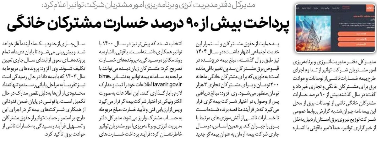 مدیرکل دفتر مدیریت انرژی و برنامهریزی امور مشتریان شرکت توانیر از تداوم اجرای طرح بیمه خسارات ناشی از نوسانات و حوادث برق برای مشترکان خانگی و تجاری خبر داد و گفت: در سال گذشته بیش از ۹۰ درصد خسارات مشترکان خانگی ناشی از نوسانات برق از محل این بیمهنامه جبران شد. به گزارش روابط عمومی شرکت توزیع نیروی برق استان اردبیل به نقل از خبرگزاری توانیر، عبدالامیر یاقوتی با اشاره به حمایت از حقوق مشترکان و استمرار این خدمت اجتماعی اظهار داشت: در سال ۱۴۰۴ نیز طبق روال گذشته، مبلغ بیمه درجشده در قبوض برق مشترکان بدون تغییر باقی مانده است؛ بهطوریکه برای مشترکان خانگی ماهانه ۳۰۰ تومان و برای مشترکان تجاری ۳ هزار تومان منظور میشود. وی افزود: مبالغ دریافتی پس از وصول، در اختیار شرکت بیمهگری قرار میگیرد که در فرآیند مناقصه برنده شده است تا خسارات ناشی از آتشسوزیهای مرتبط با برق را جبران کند. بر همین اساس، در سال جاری شرکت بیمه آرمان بهعنوان بیمهگر جدید انتخاب شده که پیشتر نیز در سال ۱۴۰۰ با توانیر همکاری داشته است. یاقوتی با اشاره به روند مکانیزه رسیدگی به پروندههای خسارت تصریح کرد: مشترکان زیاندیده میتوانند با مراجعه به سامانه بیمه توانیر به نشانی bime.tavanir.gov.ir اطلاعات خود را ثبت و مدارک لازم را بارگذاری کنند. این اطلاعات بهصورت الکترونیکی در اختیار شرکت بیمهگر قرار میگیرد و پس از ارزیابی فنی و تأیید خسارت، مبلغ مربوطه به حساب مشترک واریز میشود. مدیرکل دفتر مدیریت انرژی و برنامهریزی امور مشتریان توانیر خاطرنشان کرد: فرآیند پرداخت خسارتهای سال جاری از حدود یک ماه آینده آغاز خواهد شد و پیشبینی میشود تا پایان دیماه، تمام پروندههای معوق از ابتدای سال جاری تعیین تکلیف شوند. وی افزود: پروندههای مربوط به سال ۱۴۰۳ که با بیمه دانا در حال رسیدگی است نیز تقریباً به مراحل پایانی رسیده و تنها تعداد محدودی از آنها بهدلیل نقص مدارک در حال تکمیل است. یاقوتی در پایان ضمن قدردانی از همکاری شرکتهای بیمهگر در اجرای این طرح، بر استمرار حمایت توانیر از حقوق مشترکان و تسهیل فرآیند رسیدگی به خسارات ناشی از حوادث برق تأکید کرد.