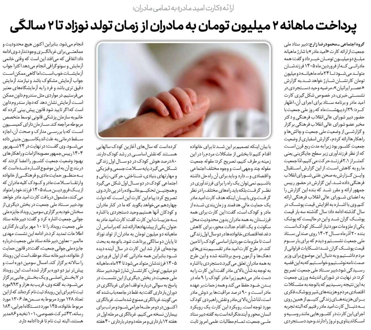 گروه اجتماعی ـ محمودرضا زارع: دبیر ستاد ملی جمعیت از ارائه کارت «امید مادر» با شارژ ماهیانه مبلغ دو میلیون تومان خبر داد و گفت: همه مادرانی که از فروردین ماه ۱۴۰۵ فرزندشان متولد میشود تا ۲۴ ماه، ماهیانه دو میلیون تومان کارتشان شارژ خواهد شد.به گزارش «عصر ایرانیان»، مرضیه وحید دستجردی در نشستی خبری، در خصوص شکلگیری کارت امید مادر و برنامه ستاد برای اجرای آن، اظهار کرد: ۲۹ اردیبهشتماه که روز ملی جمعیت با حضور دبیر شورای عالی انقلاب فرهنگی و دکتر مخبر عضو شورای عالی انقلاب فرهنگی برگزار و گزارشی از وضعیت ملی جمعیت و چالشها و راهکارها ارائه کردم ، گزارش اسفباری از وضعیت جمعیت کشور بود زیرا به مدت ربع قرن است که از نظر فرزندآوری زیر سطح جایگزینی یعنی کمتر از ۲.۱ فرزند حرکت میکنیم، لذا جمعیت ما رو به کاهش است. از این گزارش استقبال و این گزارش به صحن علنی شورای انقلاب فرهنگی داده شد. این گزارش در حضور رییس جمهور ارائه و مقرر شد که بنده این گزارش را به اعضای شورای عالی انقلاب فرهنگی ارائه کنم.وی با اشاره به افزایش قیمت پوشک در سال گذشته ادامه داد: سال گذشته سه بار قیمت پوشک گران شد و این درحالیست که پوشک یکی از ملزومات مورد نیاز آشکار کودک است. بنده ۲۰ آذرماه سال ۱۴۰۳ روی صندلی ستاد ملی جمعیت نشستم و دیدم که برای بار سوم قیمت پوشک گران شد؛ شکایات فراوانی از مردم داشتیم و به دنبال این موضوع برای وزیر صمت نامه نوشتیم و خواستیم که به این قضیه رسیدگی شود.دبیر ستاد ملی جمعیت تصریح کرد: در نهایت در شورای اندیشه ورزی جمعیت به این نتیجه رسیدیم که باتوجه به مشکلات اقتصادی مردم و هزینههای شیر و پوشک، فکری برای هزینههای زندگی کنیم. از همین روی به دنبال کارت امید مادر رفتیم که البته تجربه اجرای این کارت در کشورهایی مانند روسیه و اسکاندیناوی و نروژ را دارند.وحید دستجردی با بیان اینکه تصمیم بر این شد تا برای خانواده اقدام کنیم تا بخشی از مشکلات مردم را در این زمینه برطرف کنیم، تصریح کرد: مقوله جمعیت مقوله چند وجهی است و وجوه مختلف اجتماعی و اقتصادی و … دارد و باید برای آن راه حل داشته باشیم. نمیتوان یک راه را برای فرزندآوری در نظر گرفت بلکه باید راههای مختلف را در نظر گرفت.وی با بیان اینکه هدف کارت امید مادر یک حمایت مالیِ هدفمند و زمانبندی شده از مادر و کودک است، گفت: این کارت برای همه فرزندان به همه مادران بدون محدودیت محل سکونت و یک اقدام عدالت محور، برای کاهش دغدغه اقتصادی خانواده ها در دو سال اول زندگی است تا ملزومات موردنیاز اساسی کودک را تامین کند. در طرح کارت امید مادر تقسیم بندیهای دهکها و آزمون وسع برداشته شده و این طرح به همه مادران تعلق میگیرد.دستجردی با اشاره به توجه به شأن بالای مادر گفت: این کارت را به دست مادر میدهیم زیرا مادر کودک را ۹ ماه در بدن خود حفظ میکند و همه زحمات بر عهده مادر است و ۹۰ درصد مراقبتها بر دوش مادر است، لذا شأن بالای مادر و نقش راهبردی کودک مورد توجه است. رویکرد این کارت یک رویکرد انسان محور و آیندهنگرانه است.به گفته دبیر ستاد ملی جمعیت، تمام مطالبات علمی امروز ثابت کرده است که سالهای آغازین کودک سالهایی هستند که نقش اساسی در رشد کودک دارند. ۸۰ درصد هوش کودک در دو سال اول زندگی شکل میگیرد. پایه سلامت جسمی و فیزیکی و مهارتهای بنیادی، شناختی، حرکتی، زبانی و اجتماعی کودک در دو سال اول شکل میگیرد و همچنین تحکیم خانواده را در پی دارد.وی تصریح کرد: پیام این کارت این است که دولت چهاردهم میخواهد بگوید که ما در کنار مادران و کودکان آنها هستیم.وحید دستجردی با اشاره به جزییات این کارت گفت: کارت امید مادر به عنوان یکی از پیشنهادها ارائه شد که براساس آن ماهیانه دو میلیون تومان به مادران از تولد نوزاد تا پایان دو سالگی پرداخت شود. باتوجه به بحث بودجهای قرار شد این کارت در سال آینده دیده شود بنابراین همه مادرانی که از اول فروردین ۱۴۰۵ فرزندشان متولد میشود تا ۲۴ ماه، ماهیانه دو میلیون تو
