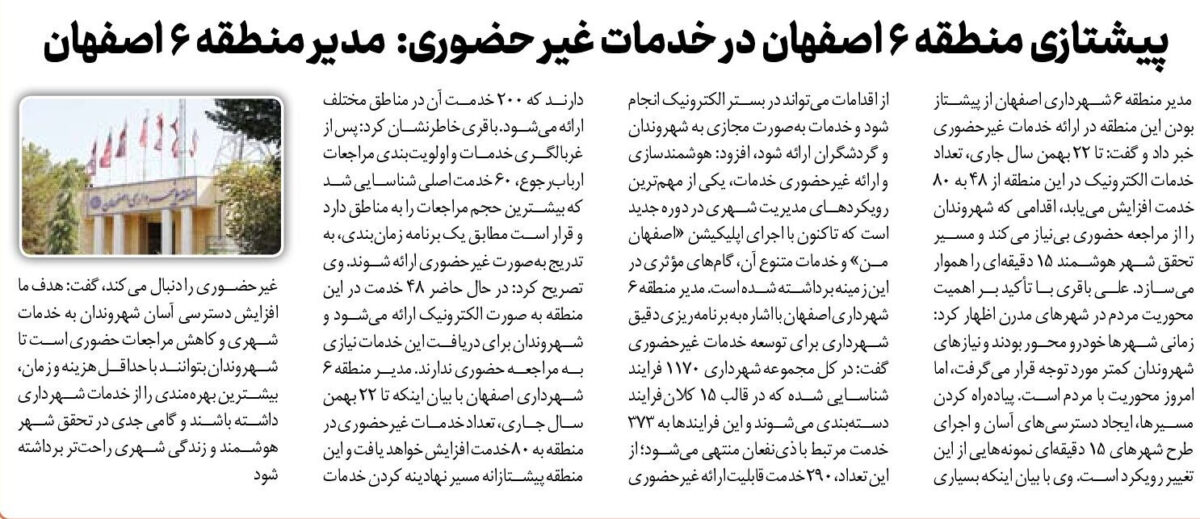 مدیر منطقه ۶ شهرداری اصفهان از پیشتاز بودن این منطقه در ارائه خدمات غیرحضوری خبر داد و گفت: تا ۲۲ بهمن سال جاری، تعداد خدمات الکترونیک در این منطقه از ۴۸ به ۸۰ خدمت افزایش مییابد، اقدامی که شهروندان را از مراجعه حضوری بینیاز میکند و مسیر تحقق شهر هوشمند ۱۵ دقیقهای را هموار میسازد. علی باقری با تأکید بر اهمیت محوریت مردم در شهرهای مدرن اظهار کرد: زمانی شهرها خودرو محور بودند و نیازهای شهروندان کمتر مورد توجه قرار میگرفت، اما امروز محوریت با مردم است. پیادهراه کردن مسیرها، ایجاد دسترسیهای آسان و اجرای طرح شهرهای ۱۵ دقیقهای نمونههایی از این تغییر رویکرد است. وی با بیان اینکه بسیاری از اقدامات میتواند در بستر الکترونیک انجام شود و خدمات بهصورت مجازی به شهروندان و گردشگران ارائه شود، افزود: هوشمندسازی و ارائه غیرحضوری خدمات، یکی از مهمترین رویکردهای مدیریت شهری در دوره جدید است که تاکنون با اجرای اپلیکیشن «اصفهان من» و خدمات متنوع آن، گامهای مؤثری در این زمینه برداشته شده است. مدیر منطقه ۶ شهرداری اصفهان با اشاره به برنامهریزی دقیق شهرداری برای توسعه خدمات غیرحضوری گفت: در کل مجموعه شهرداری ۱۱۷۰ فرایند شناسایی شده که در قالب ۱۵ کلانفرایند دستهبندی میشوند و این فرایندها به ۳۷۳ خدمت مرتبط با ذینفعان منتهی میشود؛ از این تعداد، ۲۹۰ خدمت قابلیت ارائه غیرحضوری دارند که ۲۰۰ خدمت آن در مناطق مختلف ارائه میشود. باقری خاطرنشان کرد: پس از غربالگری خدمات و اولویتبندی مراجعات اربابرجوع، ۶۰ خدمت اصلی شناسایی شد که بیشترین حجم مراجعات را به مناطق دارد و قرار است مطابق یک برنامه زمانبندی، به تدریج بهصورت غیرحضوری ارائه شوند. وی تصریح کرد: در حال حاضر ۴۸ خدمت در این منطقه به صورت الکترونیک ارائه میشود و شهروندان برای دریافت این خدمات نیازی به مراجعه حضوری ندارند. مدیر منطقه ۶ شهرداری اصفهان با بیان اینکه تا ۲۲ بهمن سال جاری، تعداد خدمات غیرحضوری در منطقه به ۸۰ خدمت افزایش خواهد یافت و این منطقه پیشتازانه مسیر نهادینه کردن خدمات غیرحضوری را دنبال میکند، گفت: هدف ما افزایش دسترسی آسان شهروندان به خدمات شهری و کاهش مراجعات حضوری است تا شهروندان بتوانند با حداقل هزینه و زمان، بیشترین بهرهمندی را از خدمات شهرداری داشته باشند و گامی جدی در تحقق شهر هوشمند و زندگی شهری راحتتر برداشته شود