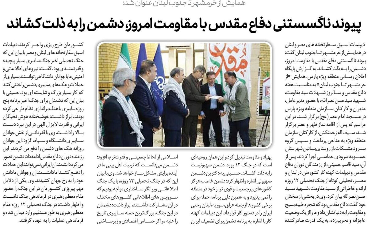 دیپلمات اسبق سفارتخانه های مصر و لبنان در همایش از خرمشهر تا جنوب لبنان گفت: پیوند ناگسستنی دفاع مقدس با مقاومت امروز، دشمن را به ذلت کشاند. به گزارش پایگاه اطلاع رسانی منطقه ویژه پارس، همایش «از خرمشهر تا جنوب لبنان» به مناسبت هفته دفاع مقدس و سالروز شهادت سید مقاومت، شهید سیدحسن نصرالله، با حضور مدیرعامل، مدیران و کارکنان سازمان منطقه ویژه پارس در مسجد امام عصر(عج) برگزار شد. در این مراسم که پس از اقامه نماز ظهر و عصر برگزار شد، سیف اله زحمتکش، از کارکنان سازمان منطقه ویژه به مداحی پرداخت و سپس گروه سرود مشکات، از روستای بساتین شهرستان عسلویه سرودی حماسی اجرا کردند. پس از آن، سید قاسم حسینی، از رزمندگان دوران دفاع مقدس و دیپلمات کهنهکار کشورمان در لبنان و مصر، تحلیلی کوتاه از جنگ تحمیلی ۱۲ روزه ارائه و خاطراتی از سید مقاومت، شهید سید حسننصرالله بیان کرد. وی در بخشی از سخنان خود گفت: دفاع مقدس بود که شجره طیبه بسیج و مقاومت را به دنیا نشان داد و ما را از یک وضعیت عاجزانه و تحریمزده، به یک قدرت صادرکننده پهپاد و مقاومت تبدیل کرد و این همان روحیهای است که در جنگ ۱۲ روزه، دشمن صهیونیست را به ذلت کشاند. حسینی به دکترین دشمن صهیونی اشاره و اظهار کرد: دشمن غاصب هرگز کشورهای پرجمعیت و قوی تر از خود در منطقه را نمی پذیرد و به همین دلیل برنامه حمله برای برخی کشورها از جمله عراق، سوریه، لبنان و حتی ایران را در دستور کار قرار داد. این دیپلمات کهنه کار با اشاره به برنامه دشمن برای تضعیف ایران اسلامی از لحاظ جمعیتی و قدرتنرم، افزود: دشمن میدانست که تربیت اهل بیتی ما در آینده برایش مشکلساز خواهد شد. وی با بیان این که در جنگ تحمیلی ۱۲ روزه، با یک جنگ اطلاعاتی ویرانگر ساختاری مواجه بودیم که سرویس های اطلاعاتی کشورهای مختلف در آن مشارکت داشتند، ابراز داشت: دشمنان در این جنگ، بزرگترین حمله سایبری تاریخ را علیه مراکز حساس اقتصادی و زیرساختی کشورمان طرح ریزی و اجرا کردند. دیپلمات اسبق سفارتخانه های لبنان و مصر با بیان این که جنگ تحمیلی اخیر جنگ سایبری بسیار پیچیده و قدرتمندی بود، گفت: نیروهای اطلاعاتی و امنیتی ما با جوانان دانشگاهی توانستند بسیاری از حملات و هک های سایبری دشمن را خنثی کنند که کار بسیار بزرگ و شایسته ای بود. حسینی با بیان این که دشمنان برای جنگ اخیر برنامه پنج روزه سایبری با هدف براندازی نظام طراحی کرده بودند، ابراز داشت: خوشبختانه هوش نخبگان ایرانی و قدرت لایزال الهی در این نبرد دست بالا را داشت. وی با قدردانی از نقش جوانان سایبری دانشگاه و سپاه، افزود: این جوانان روزانه هک های دشمن را دفع می کردند. این رزمنده دوران دفاع مقدس ادامه داد: دشمن تصور میکرد دانشمندان ایرانی نمیتوانند این حملات را دفع کنند اما دانشمندان و جوانان ما دانش خود را به رخ جهان کشیدند. وی یکی از دلایل مهم پیروزی کشورمان در این جنگ را حضور مقام معظم رهبری در فرماندهی جنگ دانست و اظهار داشت: در جنگ تحمیلی ۱۲ روزه مقام معظم رهبری به طور مستقیم وارد میدان شده و فرماندهی عملیات را به عهده گرفتند.