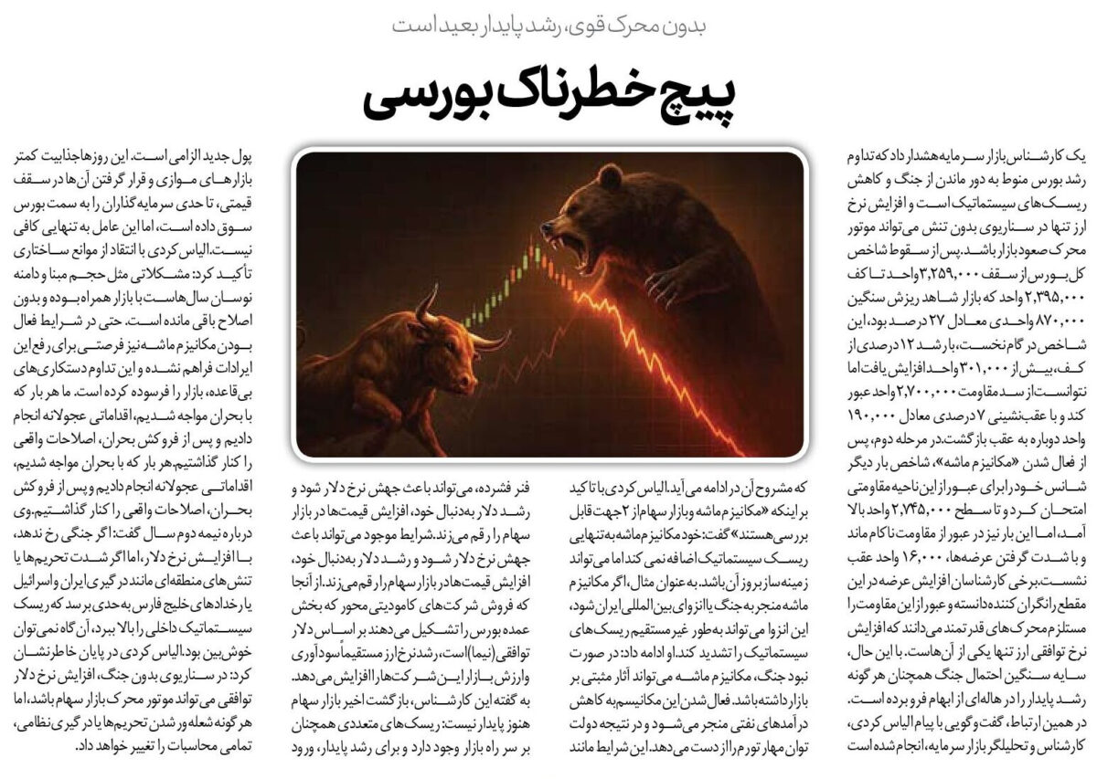 یک کارشناس بازار سرمایه هشدار داد که تداوم رشد بورس منوط به دور ماندن از جنگ و کاهش ریسکهای سیستماتیک است و افزایش نرخ ارز تنها در سناریوی بدون تنش میتواند موتور محرک صعود بازار باشد.پس از سقوط شاخص کل بورس از سقف ۳,۲۵۹,۰۰۰ واحد تا کف ۲,۳۹۵,۰۰۰ واحد که بازار شاهد ریزش سنگین ۸۷۰,۰۰۰ واحدی معادل ۲۷ درصد بود، این شاخص در گام نخست، با رشد ۱۲ درصدی از کف، بیش از ۳۰۱,۰۰۰ واحد افزایش یافت اما نتوانست از سد مقاومت ۲,۷۰۰,۰۰۰ واحد عبور کند و با عقبنشینی ۷ درصدی معادل ۱۹۰,۰۰۰ واحد دوباره به عقب بازگشت.در مرحله دوم، پس از فعال شدن «مکانیزم ماشه»، شاخص بار دیگر شانس خود را برای عبور از این ناحیه مقاومتی امتحان کرد و تا سطح ۲,۷۴۵,۰۰۰ واحد بالا آمد، اما این بار نیز در عبور از مقاومت ناکام ماند و با شدت گرفتن عرضهها، ۱۶,۰۰۰ واحد عقب نشست.برخی کارشناسان افزایش عرضه در این مقطع را نگرانکننده دانسته و عبور از این مقاومت را مستلزم محرکهای قدرتمند میدانند که افزایش نرخ توافقی ارز تنها یکی از آنهاست. با این حال، سایه سنگین احتمال جنگ همچنان هرگونه رشد پایدار را در هالهای از ابهام فرو برده است.در همین ارتباط، گفتوگویی با پیام الیاسکردی، کارشناس و تحلیلگر بازار سرمایه، انجام شده است که مشروح آن در ادامه میآید.الیاسکردی با تاکید بر اینکه «مکانیزم ماشه و بازار سهام از ۲ جهت قابل بررسی هستند» گفت: خود مکانیزم ماشه بهتنهایی ریسک سیستماتیک اضافه نمیکند اما میتواند زمینهساز بروز آن باشد. بهعنوان مثال، اگر مکانیزم ماشه منجر به جنگ یا انزوای بینالمللی ایران شود، این انزوا میتواند بهطور غیرمستقیم ریسکهای سیستماتیک را تشدید کند.او ادامه داد: در صورت نبود جنگ، مکانیزم ماشه میتواند آثار مثبتی بر بازار داشته باشد. فعال شدن این مکانیسم به کاهش درآمدهای نفتی منجر میشود و در نتیجه دولت توان مهار تورم را از دست میدهد. این شرایط مانند فنر فشرده، میتواند باعث جهش نرخ دلار شود و رشد دلار بهدنبال خود، افزایش قیمتها در بازار سهام را رقم میزند.شرایط موجود میتواند باعث جهش نرخ دلار شود و رشد دلار بهدنبال خود، افزایش قیمتها در بازار سهام را رقم میزند. از آنجا که فروش شرکتهای کامودیتیمحور که بخش عمده بورس را تشکیل میدهند بر اساس دلار توافقی (نیما) است، رشد نرخ ارز مستقیماً سودآوری و ارزش بازار این شرکتها را افزایش میدهد.به گفته این کارشناس، بازگشت اخیر بازار سهام هنوز پایدار نیست: ریسکهای متعددی همچنان بر سر راه بازار وجود دارد و برای رشد پایدار، ورود پول جدید الزامی است. این روزهاجذابیت کمتر بازارهای موازی و قرار گرفتن آنها در سقف قیمتی، تا حدی سرمایهگذاران را به سمت بورس سوق داده است، اما این عامل به تنهایی کافی نیست.الیاسکردی با انتقاد از موانع ساختاری تأکید کرد: مشکلاتی مثل حجم مبنا و دامنه نوسان سالهاست با بازار همراه بوده و بدون اصلاح باقی مانده است. حتی در شرایط فعال بودن مکانیزم ماشه نیز فرصتی برای رفع این ایرادات فراهم نشده و این تداوم دستکاریهای بیقاعده، بازار را فرسوده کرده است. ما هر بار که با بحران مواجه شدیم، اقداماتی عجولانه انجام دادیم و پس از فروکش بحران، اصلاحات واقعی را کنار گذاشتیم.هر بار که با بحران مواجه شدیم، اقداماتی عجولانه انجام دادیم و پس از فروکش بحران، اصلاحات واقعی را کنار گذاشتیم.وی درباره نیمه دوم سال گفت: اگر جنگی رخ ندهد، با افزایش نرخ دلار، اما اگر شدت تحریمها یا تنشهای منطقهای مانند درگیری ایران و اسرائیل یا رخدادهای خلیج فارس به حدی برسد که ریسک سیستماتیک داخلی را بالا ببرد، آنگاه نمیتوان خوشبین بود.الیاسکردی در پایان خاطرنشان کرد: در سناریوی بدون جنگ، افزایش نرخ دلار توافقی میتواند موتور محرک بازار سهام باشد، اما هرگونه شعلهور شدن تحریمها یا درگیری نظامی، تمامی محاسبات را تغییر خواهد داد.