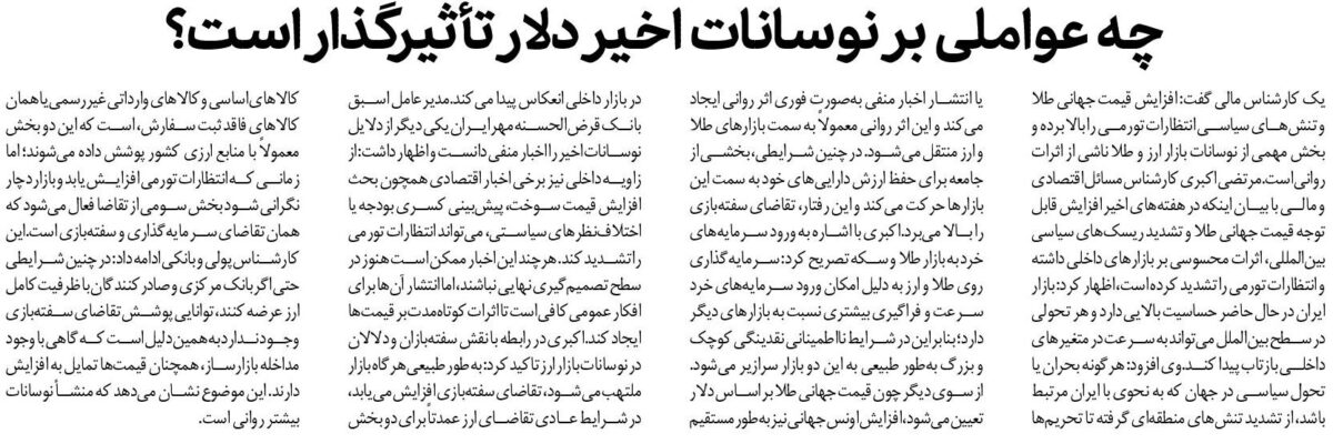 یک کارشناس مالی گفت: افزایش قیمت جهانی طلا و تنشهای سیاسی انتظارات تورمی را بالا برده و بخش مهمی از نوسانات بازار ارز و طلا ناشی از اثرات روانی است.مرتضی اکبری کارشناس مسائل اقتصادی و مالی با بیان اینکه در هفتههای اخیر افزایش قابل توجه قیمت جهانی طلا و تشدید ریسکهای سیاسی بینالمللی، اثرات محسوسی بر بازارهای داخلی داشته و انتظارات تورمی را تشدید کرده است، اظهار کرد: بازار ایران در حال حاضر حساسیت بالایی دارد و هر تحولی در سطح بینالملل میتواند به سرعت در متغیرهای داخلی بازتاب پیدا کند.وی افزود: هرگونه بحران یا تحول سیاسی در جهان که به نحوی با ایران مرتبط باشد، از تشدید تنشهای منطقهای گرفته تا تحریمها یا انتشار اخبار منفی بهصورت فوری اثر روانی ایجاد میکند و این اثر روانی معمولاً به سمت بازارهای طلا و ارز منتقل میشود. در چنین شرایطی، بخشی از جامعه برای حفظ ارزش داراییهای خود به سمت این بازارها حرکت میکند و این رفتار، تقاضای سفتهبازی را بالا میبرد.اکبری با اشاره به ورود سرمایههای خرد به بازار طلا و سکه تصریح کرد: سرمایهگذاری روی طلا و ارز به دلیل امکان ورود سرمایههای خرد سرعت و فراگیری بیشتری نسبت به بازارهای دیگر دارد؛ بنابراین در شرایط نااطمینانی نقدینگی کوچک و بزرگ بهطور طبیعی به این دو بازار سرازیر میشود. از سوی دیگر چون قیمت جهانی طلا بر اساس دلار تعیین میشود، افزایش اونس جهانی نیز بهطور مستقیم در بازار داخلی انعکاس پیدا میکند.مدیرعامل اسبق بانک قرضالحسنه مهر ایران یکی دیگر از دلایل نوسانات اخیر را اخبار منفی دانست و اظهار داشت: از زاویه داخلی نیز برخی اخبار اقتصادی همچون بحث افزایش قیمت سوخت، پیشبینی کسری بودجه یا اختلافنظرهای سیاستی، میتواند انتظارات تورمی را تشدید کند. هرچند این اخبار ممکن است هنوز در سطح تصمیمگیری نهایی نباشند، اما انتشار آنها برای افکار عمومی کافی است تا اثرات کوتاهمدت بر قیمتها ایجاد کند.اکبری در رابطه با نقش سفتهبازان و دلالان در نوسانات بازار ارز تاکید کرد: بهطور طبیعی هرگاه بازار ملتهب میشود، تقاضای سفتهبازی افزایش مییابد، در شرایط عادی تقاضای ارز عمدتاً برای دو بخش کالاهای اساسی و کالاهای وارداتی غیررسمی یا همان کالاهای فاقد ثبت سفارش، است که این دو بخش معمولاً با منابع ارزی کشور پوشش داده میشوند؛ اما زمانی که انتظارات تورمی افزایش یابد و بازار دچار نگرانی شود بخش سومی از تقاضا فعال میشود که همان تقاضای سرمایهگذاری و سفتهبازی است.این کارشناس پولی و بانکی ادامه داد: در چنین شرایطی حتی اگر بانک مرکزی و صادرکنندگان با ظرفیت کامل ارز عرضه کنند، توانایی پوشش تقاضای سفتهبازی وجود ندارد به همین دلیل است که گاهی با وجود مداخله بازارساز، همچنان قیمتها تمایل به افزایش دارند. این موضوع نشان میدهد که منشأ نوسانات بیشتر روانی است.