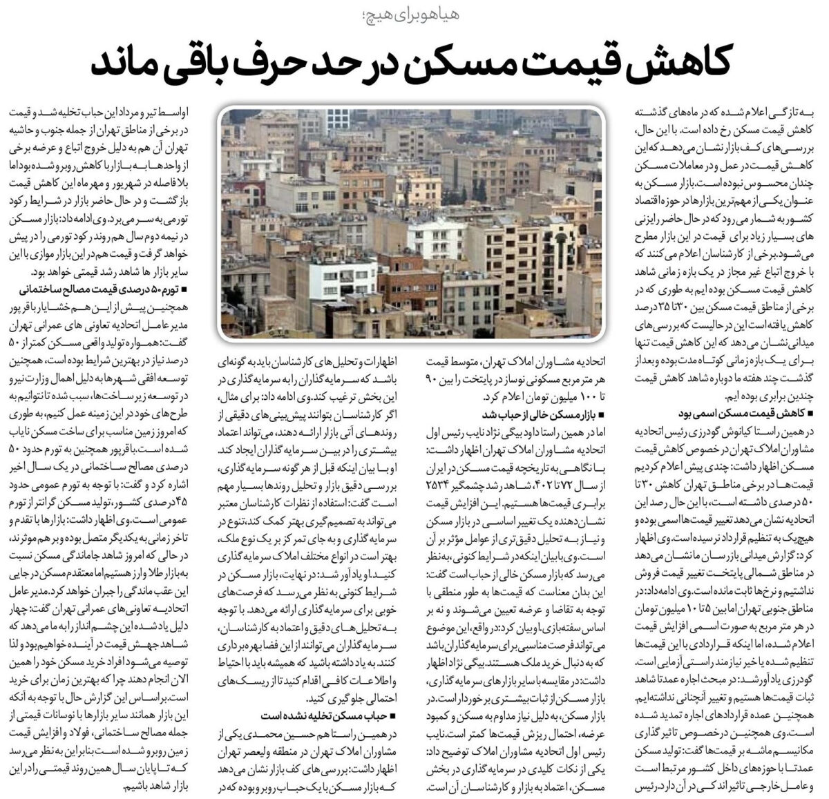 در همین راستا کیانوش گودرزی رئیس اتحادیه مشاوران املاک تهران در خصوص کاهش قیمت مسکن اظهار داشت: چندی پیش اعلام کردیم قیمتها در برخی مناطق تهران کاهش ۳۰ تا ۵۰ درصدی داشته است، با این حال رصد این اتحادیه نشان میدهد تغییر قیمتها اسمی بوده و هیچیک به تنظیم قرارداد نرسیده است.وی اظهار کرد: گزارش میدانی بازرسان ما نشان میدهد در مناطق شمالی پایتخت تغییر قیمت فروش نداشتیم و نرخها ثابت مانده است.وی ادامهداد: در مناطق جنوبی تهران اما بین ۵ تا ۱۰ میلیون تومان در هر متر مربع به صورت اسمی افزایش قیمت اعلام شده، اما اینکه قراردادی با این قیمتها تنظیم شده یا خیر نیازمند راستیآزمایی است.گودرزی یادآورشد: در مبحث اجاره عمدتا شاهد ثبات قیمتها هستیم و تغییر آنچنانی نداشتهایم. همچنین عمده قراردادهای اجاره تمدید شده است.وی همچنین درخصوص تاثیرگذاری مکانیسم ماشه بر قیمتها گفت: تولید مسکن عمدتا با حوزههای داخل کشور مرتبط است و عامل خارجی تاثیر اندکی در آن دارد.رئیس اتحادیه مشاوران املاک تهران، متوسط قیمت هر مترمربع مسکونی نوساز در پایتخت را بین ۹۰ تا ۱۰۰ میلیون تومان اعلام کرد.