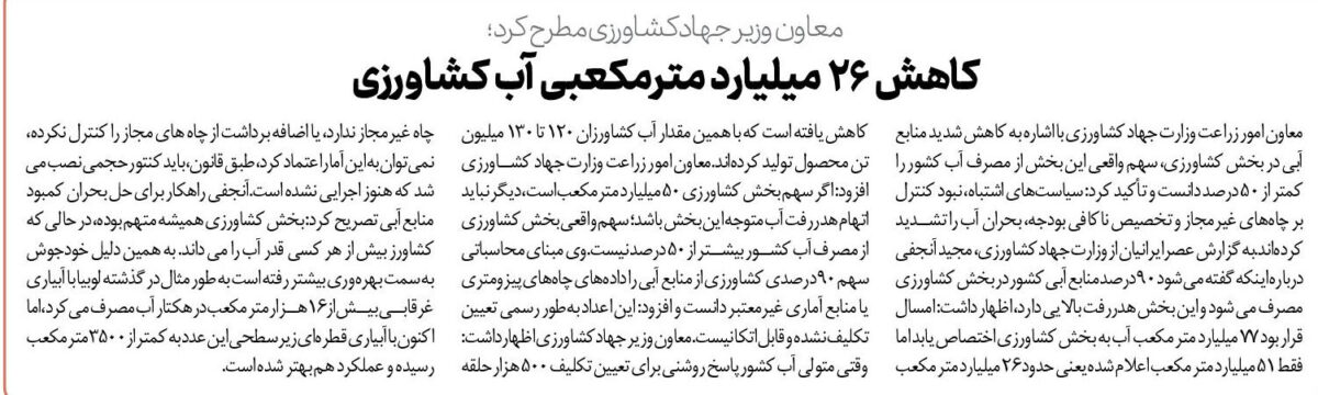 معاون امور زراعت وزارت جهاد کشاورزی با اشاره به کاهش شدید منابع آبی در بخش کشاورزی، سهم واقعی این بخش از مصرف آب کشور را کمتر از ۵۰ درصد دانست و تأکید کرد: سیاستهای اشتباه، نبود کنترل بر چاههای غیرمجاز و تخصیص ناکافی بودجه، بحران آب را تشدید کردهاند.به گزارش عصرایرانیان از وزارت جهاد کشاورزی، مجید آنجفی درباره اینکه گفته می شود ۹۰ درصد منابع آبی کشور در بخش کشاورزی مصرف می شود و این بخش هدررفت بالایی دارد، اظهار داشت: امسال قرار بود ۷۷ میلیارد متر مکعب آب به بخش کشاورزی اختصاص یابد اما فقط ۵۱ میلیارد متر مکعب اعلام شده یعنی حدود ۲۶ میلیارد متر مکعب کاهش یافته است که با همین مقدار آب کشاورزان ۱۲۰ تا ۱۳۰ میلیون تن محصول تولید کردهاند.معاون امور زراعت وزارت جهاد کشاورزی افزود: اگر سهم بخش کشاورزی ۵۰ میلیارد مترمکعب است، دیگر نباید اتهام هدررفت آب متوجه این بخش باشد؛ سهم واقعی بخش کشاورزی از مصرف آب کشور بیشتر از ۵۰ درصد نیست.وی مبنای محاسباتی سهم ۹۰ درصدی کشاورزی از منابع آبی را دادههای چاههای پیزومتری یا منابع آماری غیرمعتبر دانست و افزود: این اعداد بهطور رسمی تعیین تکلیف نشده و قابل اتکا نیست.معاون وزیر جهادکشاورزی اظهارداشت: وقتی متولی آب کشور پاسخ روشنی برای تعیین تکلیف ۵۰۰ هزار حلقه چاه غیرمجاز ندارد، یا اضافه برداشت از چاه های مجاز را کنترل نکرده، نمیتوان به این آمار اعتماد کرد، طبق قانون، باید کنتور حجمی نصب می شد که هنوز اجرایی نشده است.آنجفی راهکار برای حل بحران کمبود منابع آبی تصریح کرد: بخش کشاورزی همیشه متهم بوده، در حالی که کشاورز بیش از هر کسی قدر آب را می داند. به همین دلیل خودجوش به سمت بهرهوری بیشتر رفته است به طور مثال در گذشته لوبیا با آبیاری غرقابی بیش از ۱۶ هزار متر مکعب در هکتار آب مصرف میکرد، اما اکنون با آبیاری قطرهای زیرسطحی این عدد به کمتر از ۳۵۰۰ متر مکعب رسیده و عملکرد هم بهتر شده است.