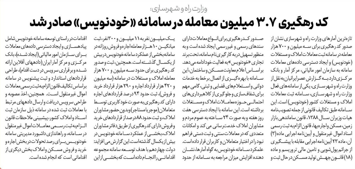 تازهترین آمارهای وزارت راه و شهرسازی نشان از صدور کد رهگیری برای سه میلیون و ۷۰۰ هزار معامله در سامانه ثبت معاملات املاک و مستغلات (خودنویس) و ایجاد دسترسی دادههای معاملات سامانه به سازمان امور مالیاتی، مرکز آمار و بانک مرکزی دارد.به گزارش عصرایرانیان به نقل از وزارت راه و شهرسازی، یکی از سامانههای فعال وزارت راه و شهرسازی، سامانه ثبت معاملات املاک و مستغلات کشور (خودنویس) است. این سامانه طبق تکالیف قانونی از جمله تصویبنامه هیات وزیران سال ۱۳۸۸، قانون ساماندهی بازار زمین، مسکن و اجارهبها، قانون الزام به ثبت رسمی اسناد اموال غیرمنقول و آییننامه اجرایی ماده (۳) آن، ماده ۲۳ آییننامه اجرایی مقابله با پیشگیری از جرائم پولشویی و تامین مالی تروریسم و ماده (۱۸) قانون جهش تولید مسکن در حال ثبت و صدور کد رهگیری برای انواع معاملات دارای سندهای رسمی و غیررسمی ایجاد شده است و به منظور تسهیل در به کارگیری نام سامانه، تحت برند تجاری «خودنویس» به فعالیت خود ادامه میدهد.بر اساس اعلام معاونت مسکن و ساختمان، این سامانه با بهرهگیری از اتصال برخط به خدمات دولتی و استعلامهای قضایی و ثبتی، گامی مهم برای شفافسازی و جلوگیری از کلاهبرداریهای احتمالی حوزه معاملات املاک و مستغلات برداشته است. این سامانه با ایجاد دسترسی هفت روز هفته و به صورت ۲۴ ساعته به عموم مردم و مشاوران املاک خدمترسانی میکند و امکانات متعددی که در معاملات سنتی و ثبت دستی فراهم نبود را در اختیار متعاملان و کاربران قرار داده است. علمکرد سامانه خودنویس به گواه آمارها، نشان دهنده افزایش میزان مراجعه به سامانه از حدود یک میلیون نفر به ۱۱ میلیون و ۳۰۰ نفر، ثبت میانگین ۱۰ هزار معامله اجاره و فروش روزانه در سامانه بخشی از عملکرد سامانه خودنویس در بیش از یکسال گذشته است. همچنین، ثبت و صدور کد رهگیری برای حدود سه میلیون و ۷۰۰ هزار معامله املاک و مستغلات در سامانه (سه میلیون و ۴۲۰ هزار قرارداد اجاره و ۲۹۰ هزار قرارداد خرید و فروش)، ثبت حدود ۹۴ درصد قراردادهای اجاره دارای کد رهگیری به صورت خودکاربری توسط متعاملان (موجر یا مستاجر) و بدون حضور مشاوران املاک، و ثبت حدود ۸۸ درصد از قراردادهای خرید و فروش دارای کد رهگیری از طریق دفاتر مشاوران املاک، بخشی از عملکرد سامانه خودنویس در بیش از یکسال گذشته است. این گزارش می افزاید: دولت چهاردهم با هدف توسعه سامانه مجموعه اقداماتی را انجام داده است که بخشی از این اقدامات در راستای توسعه سامانه خودنویس شامل پیادهسازی و ایجاد دسترسی دادههای معاملات برای سازمان امور مالیاتی (ایجاد شده)، بانک مرکزی و مرکز آمار ایران (دادههای آفلاین ارائه شده و برقراری سرویس در دست اقدام)، طراحی قراردادهای استاندارد و ثبت پیشنویس در سامانه براساس تکالیف قانون الزام به ثبت رسمی معاملات اموال غیرمنقول است. همچنین، اخذ مصوبه و طراحی سرویس دریافت و ارسال دادههای مرتبط با معاملات ثبت شده در سامانه ذیل سازمان ثبت اسناد و املاک کشور، پیشبینی ملاحظات قانون الزام به ثبت رسمی معاملات اموال غیرمنقول در سامانه، و راهاندازی داشبورد مدیریتی سامانه خودنویس برای رصد تحولات در بخش اجاره و خرید و فروش مسکن و املاک بخش دیگری از اقداماتی است که انجام شده است.