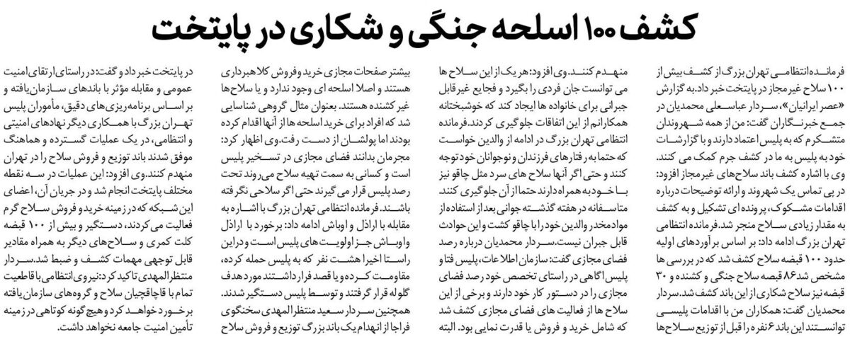 فرمانده انتظامی تهران بزرگ از کشف بیش از ۱۰۰ سلاح غیرمجاز در پایتخت خبر داد.به گزارش «عصر ایرانیان»، سردار عباسعلی محمدیان در جمع خبرنگاران گفت: من از همه شهروندان متشکرم که به پلیس اعتماد دارند و با گزارشات خود به پلیس به ما در کشف جرم کمک می کنند.وی با اشاره کشف باند سلاحهای غیرمجاز افزود: در پی تماس یک شهروند و ارائه توضیحات درباره اقدامات مشکوک، پرونده ای تشکیل و به کشف به مقدار زیادی سلاح منجر شد.فرمانده انتظامی تهران بزرگ ادامه داد: بر اساس برآوردهای اولیه حدود ۱۰۰ قبضه سلاح کشف شد که در بررسی ها مشخص شد۸۶ قبصه سلاح جنگی و کشنده و ۳۰ قبضه نیز سلاح شکاری از این باند کشف شد.سردار محمدیان گفت: همکاران من با اقدامات پلیسی توانستند این باند ۶ نفره را قبل از توزیع سلاحها منهدم کنند.وی افزود: هر یک از این سلاح ها می توانست جان فردی را بگیرد و فجایع غیرقابل جبرانی برای خانواده ها ایجاد کند که خوشبختانه همکارانم از این اتفاقات جلوگیری کردند.فرمانده انتظامی تهران بزرگ در ادامه از والدین خواست که حتما به رفتارهای فرزندان و نوجوانان خود توجه کنند و حتی اگر آنها سلاح های سرد مثل چاقو نیز با خود به همراه دارند حتما از آن جلوگیری کنند. متاسفانه در هفته گذشته جوانی بعد از استفاده از موادمخدر والدین خود را با چاقو کشت و این حوادث قابل جبران نیست.سردار محمدیان درباره رصد فضای مجازی گفت: سازمان اطلاعات، پلیس فتا و پلیس اگاهی در راستای تخصص خود رصد فضای مجازی را در دستور کار خود دارند و برخی از این سلاح ها از فعالیت های فضای مجازی کشف شد که شامل خرید و فروش یا قدرت نمایی بود. البته بیشتر صفحات مجازی خرید وفروش کلاهبرداری هستند و اصلا اسلحه ای وجود ندارد و یا سلاحها غیرکشنده هستند. بعنوان مثال گروهی شناسایی شد که افراد برای خرید اسلحه ها از آنها اقدام کرده بودند اما پولشان از دست رفت.وی اظهار کرد: مجرمان بدانند فضای مجازی در تسخیر پلیس است و کسانی به سمت تهیه سلاح میروند تحت رصد پلیس قرار میگیرند حتی اگر سلاحی نگرفته باشند.فرمانده انتظامی تهران بزرگ با اشاره به مقابله با اراذل و اوباش ادامه داد: برخورد با اراذل و اوباش جز اولویت های پلیس است و دراین راستا اخیرا هشت نفر که به پلیس حمله کرده، مقاومت کرده و یا قصد فرار داشتند مورد هدف گلوله قرار گرفتند و توسط پلیس دستگیر شدند.همچنین سردار سعید منتظرالمهدی سخنگوی فراجا از انهدام یک باند بزرگ توزیع و فروش سلاح در پایتخت خبر داد و گفت: در راستای ارتقای امنیت عمومی و مقابله مؤثر با باندهای سازمانیافته و بر اساس برنامهریزیهای دقیق، مأموران پلیس تهران بزرگ با همکاری دیگر نهادهای امنیتی و انتظامی، در یک عملیات گسترده و هماهنگ موفق شدند باند توزیع و فروش سلاح را در تهران منهدم کنند.وی افزود: این عملیات در سه نقطه مختلف پایتخت انجام شد و در جریان آن، اعضای این شبکه که در زمینه خرید و فروش سلاح گرم فعالیت میکردند، دستگیر و بیش از ۱۰۰ قبضه کلت کمری و سلاحهای دیگر به همراه مقادیر قابل توجهی مهمات کشف و ضبط شد.سردار منتظرالمهدی تاکید کرد: نیروی انتظامی با قاطعیت تمام با قاچاقچیان سلاح و گروههای سازمانیافته برخورد خواهد کرد و هیچگونه کوتاهی در زمینه تأمین امنیت جامعه نخواهد داشت.