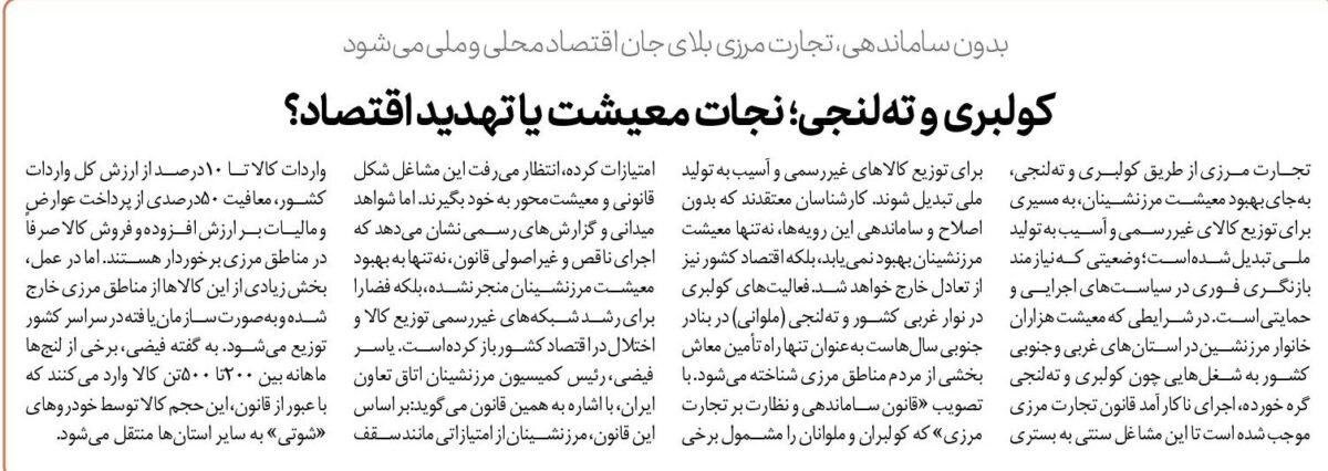 تجارت مرزی از طریق کولبری و ته‌لنجی، به‌جای بهبود معیشت مرزنشینان، به مسیری برای توزیع کالای غیررسمی و آسیب به تولید ملی تبدیل شده است؛ وضعیتی که نیازمند بازنگری فوری در سیاست‌های اجرایی و حمایتی است. در شرایطی که معیشت هزاران خانوار مرزنشین در استان‌های غربی و جنوبی کشور به شغل‌هایی چون کولبری و ته‌لنجی گره خورده، اجرای ناکارآمد قانون تجارت مرزی موجب شده است تا این مشاغل سنتی به بستری برای توزیع کالاهای غیررسمی و آسیب به تولید ملی تبدیل شوند. کارشناسان معتقدند که بدون اصلاح و ساماندهی این رویه‌ها، نه‌تنها معیشت مرزنشینان بهبود نمی‌یابد، بلکه اقتصاد کشور نیز از تعادل خارج خواهد شد.فعالیت‌های کولبری در نوار غربی کشور و ته‌لنجی (ملوانی) در بنادر جنوبی سال‌هاست به‌عنوان تنها راه تأمین معاش بخشی از مردم مناطق مرزی شناخته می‌شود. با تصویب «قانون ساماندهی و نظارت بر تجارت مرزی» که کولبران و ملوانان را مشمول برخی امتیازات کرده، انتظار می‌رفت این مشاغل شکل قانونی و معیشت‌محور به خود بگیرند. اما شواهد میدانی و گزارش‌های رسمی نشان می‌دهد که اجرای ناقص و غیراصولی قانون، نه‌تنها به بهبود معیشت مرزنشینان منجر نشده، بلکه فضا را برای رشد شبکه‌های غیررسمی توزیع کالا و اختلال در اقتصاد کشور باز کرده است. یاسر فیضی، رئیس کمیسیون مرزنشینان اتاق تعاون ایران، با اشاره به همین قانون می‌گوید:بر اساس این قانون، مرزنشینان از امتیازاتی مانند سقف واردات کالا تا 10درصد از ارزش کل واردات کشور، معافیت 50درصدی از پرداخت عوارض و مالیات بر ارزش افزوده و فروش کالا صرفاً در مناطق مرزی برخوردار هستند. اما در عمل، بخش زیادی از این کالاها از مناطق مرزی خارج شده و به‌صورت سازمان‌یافته در سراسر کشور توزیع می‌شود. به گفته فیضی، برخی از لنج‌ها ماهانه بین 200تا 500تن کالا وارد می‌کنند که با عبور از قانون، این حجم کالا توسط خودروهای «شوتی» به سایر استان‌ها منتقل می‌شود.