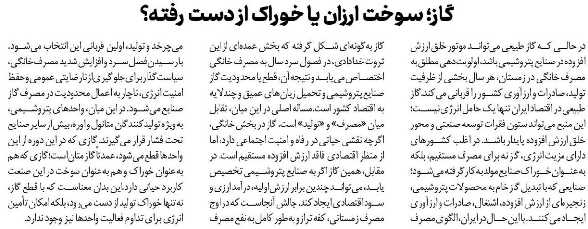 در حالی که گاز طبیعی میتواند موتور خلق ارزش افزوده در صنایع پتروشیمی باشد، اولویتدهی مطلق به مصرف خانگی در زمستان، هر سال بخشی از ظرفیت تولید، صادرات و ارزآوری کشور را قربانی میکند.گاز طبیعی در اقتصاد ایران تنها یک حامل انرژی نیست؛ این منبع میتواند ستون فقرات توسعه صنعتی و محور خلق ارزش افزوده پایدار باشد. در اغلب کشورهای دارای مزیت انرژی، گاز نه برای مصرف مستقیم، بلکه بهعنوان خوراک صنایع مولد بهکار گرفته میشود؛ صنایعی که با تبدیل گاز خام به محصولات پتروشیمی، زنجیرهای از ارزش افزوده، اشتغال، صادرات و ارزآوری ایجاد میکنند. با این حال در ایران، الگوی مصرف گاز بهگونهای شکل گرفته که بخش عمدهای از این ثروت خدادادی، در فصول سرد سال به مصرف خانگی اختصاص مییابد و نتیجه آن، قطع یا محدودیت گاز صنایع پتروشیمی و تحمیل زیانهای عمیق و چندلایه به اقتصاد کشور است.مساله اصلی در این میان، تقابل میان «مصرف» و «تولید» است. گاز در بخش خانگی، اگرچه نقشی حیاتی در رفاه و امنیت اجتماعی دارد، اما از منظر اقتصادی فاقد ارزش افزوده مستقیم است. در مقابل، همین گاز اگر به صنایع پتروشیمی تخصیص یابد، میتواند چندین برابر ارزش اولیه، درآمد ارزی و سود اقتصادی ایجاد کند. چالش آنجاست که در اوج مصرف زمستانی، کفه ترازو بهطور کامل به نفع مصرف میچرخد و تولید، اولین قربانی این انتخاب میشود. با رسیدن فصل سرد و افزایش شدید مصرف خانگی، سیاستگذار برای جلوگیری از نارضایتی عمومی و حفظ امنیت انرژی، ناچار به اعمال محدودیت در مصرف گاز صنایع میشود. در این میان، واحدهای پتروشیمی، بهویژه تولیدکنندگان متانول و اوره، بیش از سایر صنایع تحت فشار قرار میگیرند. گازی که در این دوره از این واحدها قطع میشود، عمدتاً گاز متان است؛ گازی که هم بهعنوان خوراک و هم بهعنوان سوخت در این صنعت کاربرد حیاتی دارد.این بدان معناست که با قطع گاز، نهتنها خوراک تولید از دست میرود، بلکه امکان تأمین انرژی برای تداوم فعالیت واحدها نیز وجود ندارد.