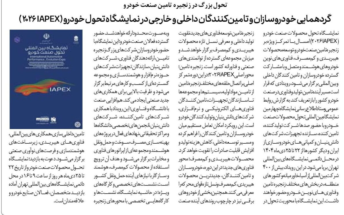نمایشگاه تحول محصولات صنعت خودرو (IAPEX 2026) امسال با تمرکز ویژه بر زنجیره تامین صنعت خودرو، توسعه محصولات هیبریدی و کممصرف، فناوریهای نوین خودروهای هوشمند و متصل و با مشارکت گسترده خودروسازان و تامینکنندگان داخلی و بینالمللی برگزار میشود، رویدادی که قرار است مسیر آینده تامین، تولید و فناوری در صنعت خودرو کشور را بازتعریف کند. به گزارش روابط عمومی و ستاد اطلاعرسانی نمایشگاه: چهارمین نمایشگاه بینالمللی تحول محصولات صنعت خودرو با حضور صدها شرکت تولیدکننده، تامینکننده، سازنده تجهیزات، شرکتهای دانشبنیان و کمپانیهای خودروسازی از ایران و دیگر کشورها از ۲۲ تا ۲۵ دیماه ۱۴۰۴ در محل دائمی نمایشگاههای بینالمللی تهران برپا میشود. در این رویداد، بیش از ۴۰۰ شرکت بینالمللی از آسیا، خاورمیانه و کشورهای منطقه، در بخشهای مختلف زنجیره تامین و فناوریهای نوین خودرو حضور خواهند داشت. این نمایشگاه با محوریت تحول در زنجیره تامین، توسعه فناوریهای جدید، تقویت تولید داخلی و معرفی نسل تازه محصولات هیبریدی و کممصرف برگزار خواهد شد و میزبان مجموعهای گسترده از توانمندیهای صنعتی و فناورانه کشور است. زنجیره تامین؛ محور اصلی IAPEX 2026؛ در این دوره، تمرکز اصلی بر اتصال حلقههای مختلف زنجیره تامین از تامین مواد اولیه، سیستمها و مجموعهها تا سازندگان تجهیزات، تامینکنندگان فناوریهای الکترونیکی و نرمافزاری، شرکتهای دانشبنیان و تولیدکنندگان خودرو است. این رویکرد امکان تعامل مستقیم میان خودروسازان و تامینکنندگان را فراهم کرده و مسیر توسعه داخلی، کاهش هزینه تولید و افزایش قابلیت صادرات را تقویت خواهد کرد. محصولات هیبریدی و کممصرف؛ محور فناوریهای جدید؛ در این دوره، خودروسازان و تامینکنندگان، جدیدترین محصولات هیبریدی، کممصرف و نسل تازه قوای محرکه را معرفی میکنند. همچنین بخشی از خودروهای برقی نیز در چارچوب روندهای آینده صنعت و بهصورت محدود ارائه خواهد شد. حضور گسترده فعالان صنعت خودرو؛ این نمایشگاه با حضور خودروسازان، شرکتهای بزرگ زنجیره تامین، ارائهدهندگان فناوری، شرکتهای دانشبنیان، سازندگان تجهیزات، شرکتهای حوزه نرمافزار و هوشمندسازی و مجموعه گستردهای از کسبوکارهای مرتبط برگزار میشود و ظرفیت بالایی برای همکاریهای جدید صنعتی ایجاد میکند. همافزایی صنعت با دانشگاه و فناوری؛ این رویداد با همکاری شرکتهای تامینکننده، شرکتهای دانشبنیان، انجمنهای تخصصی، دانشگاهها و مراکز تحقیقاتی، نهادهای فعال در پروژههای بهینهسازی مصرف سوخت و حملونقل هوشمند و مجموعهای از اپراتورهای فناوری و مخابرات برگزار میشود و هدف آن ترویج استفاده از محصولات کممصرف، هوشمند و سازگار با نیازهای آینده حملونقل کشور است. نشستهای تخصصی و کارگاههای ویژه؛ در حاشیه نمایشگاه، نشستها و کارگاههایی تخصصی با محورهای زنجیره تامین، داخلیسازی، همکاریهای بینالمللی، فناوریهای هیبریدی، زیرساختهای هوشمندسازی و فرصتهای نوآوری صنعتی برگزار میشود. دعوت به بازدید؛ نمایشگاه تحول محصولات صنعت خودرو از تاریخ ۲۲ تا ۲۵ دیماه هر روز از ساعت ۹ تا ۱۶ در محل دائمی نمایشگاههای بینالمللی تهران آماده بازدید متخصصان، فعالان صنایع خودرو و علاقهمندان است.