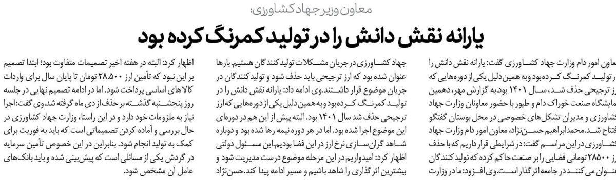 معاون امور دام وزارت جهاد کشاورزی گفت: یارانه نقش دانش را در تولید کمرنگ کرده بود و به همین دلیل یکی از دورههایی که ارز ترجیحی حذف شد، سال ۱۴۰۱ بود.به گزارش مهر، دهمین نمایشگاه صنعت خوراک دام و طیور با حضور معاونان وزارت جهاد کشاورزی و مدیران تشکلهای خصوصی در محل بوستان گفتگو افتتاح شد.محمدابراهیم حسننژاد، معاون امور دام وزارت جهاد کشاورزی در این مراسم گفت: در شرایطی قرار داریم که با حذف ارز ۲۸۵۰۰ تومانی فضایی را بر صنعت حاکم کرده که تولیدکنندگان عنوان میکنند در جامعه اثرگذار است.وی افزود: ما در وزارت جهاد کشاورزی در جریان مشکلات تولیدکنندگان هستیم. بارها عنوان شده بود که ارز ترجیحی باید حذف شود و تولیدکنندگان در جریان موضوع قرار داشتند.وی ادامه داد: یارانه نقش دانش را در تولید کمرنگ کرده بود و به همین دلیل یکی از دورههایی که ارز ترجیحی حذف شد سال ۱۴۰۱ بود. البته پیش از این هم در دورهای این موضوع اجرا شده بود. اما در هر دوره نیمه رها شده بود و دوباره شاهد گرانسازی نرخ ارز در این فضا بودیم.این مسئول دولتی اظهار کرد: امیدواریم در این مرحله موضوع درست مدیریت شود و بیشترین اثرگذاری را شاهد باشیم و مسیر ادامه پیدا کند.حسننژاد اظهار کرد: البته در هفته اخیر تصمیمات متفاوت بود؛ ابتدا تصمیم بر این نبود که تأمین ارز ۲۸.۵۰۰ تومان تا پایان سال برای واردات کالاهای اساسی پرداخت شود. اما در ادامه تصمیم نهایی در جلسه روز پنجشنبه گذشته بر حذف از دی ماه گرفته شد.وی گفت: اجرا نیاز به ملزومات خود دارد و در این راستا، وزارت جهاد کشاورزی در حال بررسی و آماده کردن تصمیماتی است که باید به فوریت برای کمک به تولید انجام شود. بنابراین در این خصوص تأمین سرمایه در گردش یکی از مسائلی است که پیشبینی شده و باید بانکهای عامل آن مشخص شود.