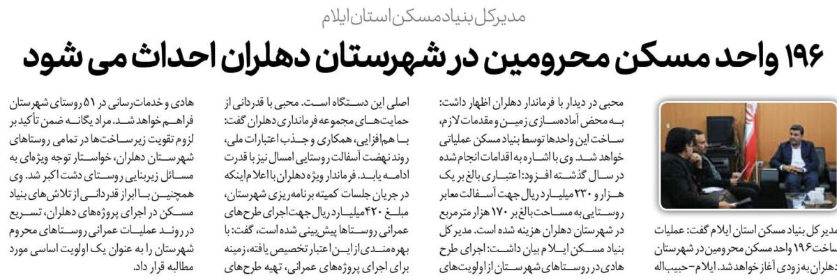 مدیرکل بنیاد مسکن استان ایلام گفت: عملیات ساخت ۱۹۶ واحد مسکن محرومین در شهرستان دهلران به زودی آغاز خواهد شد. ایلام- حبیباله محبی در دیدار با فرماندار دهلران اظهار داشت: به محض آمادهسازی زمین و مقدمات لازم، ساخت این واحدها توسط بنیاد مسکن عملیاتی خواهد شد. وی با اشاره به اقدامات انجام شده در سال گذشته افزود: اعتباری بالغ بر یک هزار و ۲۳۰ میلیارد ریال جهت آسفالت معابر روستایی به مساحت بالغ بر ۱۷۰ هزار مترمربع در شهرستان دهلران هزینه شده است. مدیرکل بنیاد مسکن ایلام بیان داشت: اجرای طرح هادی در روستاهای شهرستان از اولویتهای اصلی این دستگاه است. محبی با قدردانی از حمایتهای مجموعه فرمانداری دهلران گفت: با همافزایی، همکاری و جذب اعتبارات ملی، روند نهضت آسفالت روستایی امسال نیز با قدرت ادامه یابد. فرماندار ویژه دهلران با اعلام اینکه در جریان جلسات کمیته برنامهریزی شهرستان، مبلغ ۴۲۰ میلیارد ریال جهت اجرای طرحهای عمرانی روستاها پیشبینی شده است، گفت: با بهرهمندی از این اعتبار تخصیص یافته، زمینه برای اجرای پروژههای عمرانی، تهیه طرحهای هادی و خدماترسانی در ۵۱ روستای شهرستان فراهم خواهد شد. مراد یگانه ضمن تأکید بر لزوم تقویت زیرساختها در تمامی روستاهای شهرستان دهلران، خواستار توجه ویژهای به مسائل زیربنایی روستای دشت اکبر شد. وی همچنین با ابراز قدردانی از تلاشهای بنیاد مسکن در اجرای پروژههای دهلران، تسریع در روند عملیات عمرانی روستاهای محروم شهرستان را به عنوان یک اولویت اساسی مورد مطالبه قرار داد.