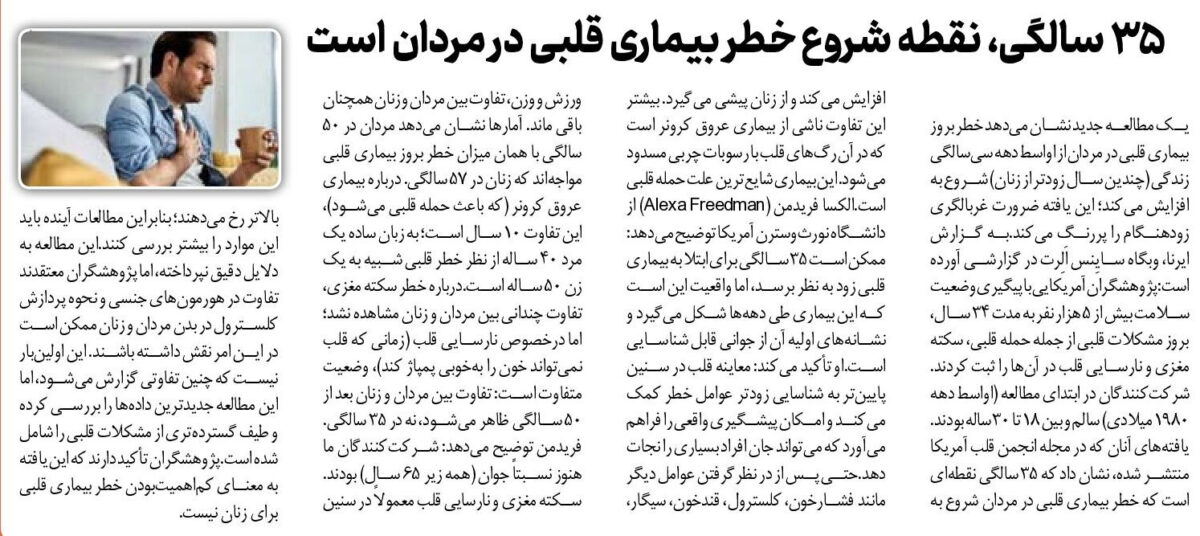 یک مطالعه جدید نشان میدهد خطر بروز بیماری قلبی در مردان از اواسط دهه سیسالگی زندگی (چندین سال زودتر از زنان) شروع به افزایش میکند؛ این یافته ضرورت غربالگری زودهنگام را پررنگ میکند.به گزارش ایرنا، وبگاه سایِنس اَلِرت در گزارشی آورده است:پژوهشگران آمریکایی با پیگیری وضعیت سلامت بیش از ۵ هزار نفر به مدت ۳۴ سال، بروز مشکلات قلبی از جمله حمله قلبی، سکته مغزی و نارسایی قلب در آنها را ثبت کردند. شرکتکنندگان در ابتدای مطالعه (اواسط دهه ۱۹۸۰ میلادی) سالم و بین ۱۸ تا ۳۰ ساله بودند.یافتههای آنان که در مجله انجمن قلب آمریکا منتشر شده، نشان داد که ۳۵ سالگی نقطهای است که خطر بیماری قلبی در مردان شروع به افزایش میکند و از زنان پیشی میگیرد. بیشتر این تفاوت ناشی از بیماری عروق کرونر است که در آن رگهای قلب با رسوبات چربی مسدود میشود. این بیماری شایعترین علت حمله قلبی است.الکسا فریدمن (Alexa Freedman) از دانشگاه نورثوسترن آمریکا توضیح میدهد: ممکن است ۳۵ سالگی برای ابتلا به بیماری قلبی زود به نظر برسد، اما واقعیت این است که این بیماری طی دههها شکل میگیرد و نشانههای اولیه آن از جوانی قابل شناسایی است.او تأکید میکند: معاینه قلب در سنین پایینتر به شناسایی زودتر عوامل خطر کمک میکند و امکان پیشگیری واقعی را فراهم میآورد که میتواند جان افراد بسیاری را نجات دهد.حتی پس از در نظرگرفتن عوامل دیگر مانند فشارخون، کلسترول، قندخون، سیگار، ورزش و وزن، تفاوت بین مردان و زنان همچنان باقی ماند. آمارها نشان میدهد مردان در ۵۰ سالگی با همان میزان خطر بروز بیماری قلبی مواجهاند که زنان در ۵۷ سالگی. درباره بیماری عروق کرونر (که باعث حمله قلبی میشود)، این تفاوت ۱۰ سال است؛ به زبان ساده یک مرد ۴۰ ساله از نظر خطر قلبی شبیه به یک زن ۵۰ ساله است.درباره خطر سکته مغزی، تفاوت چندانی بین مردان و زنان مشاهده نشد؛ اما درخصوص نارسایی قلب (زمانی که قلب نمیتواند خون را بهخوبی پمپاژ کند)، وضعیت متفاوت است: تفاوت بین مردان و زنان بعد از ۵۰ سالگی ظاهر میشود، نه در ۳۵ سالگی.فریدمن توضیح میدهد: شرکتکنندگان ما هنوز نسبتاً جوان (همه زیر ۶۵ سال) بودند. سکته مغزی و نارسایی قلب معمولاً در سنین بالاتر رخ میدهند؛ بنابراین مطالعات آینده باید این موارد را بیشتر بررسی کنند.این مطالعه به دلایل دقیق نپرداخته، اما پژوهشگران معتقدند تفاوت در هورمونهای جنسی و نحوه پردازش کلسترول در بدن مردان و زنان ممکن است در این امر نقش داشته باشند. این اولینبار نیست که چنین تفاوتی گزارش میشود، اما این مطالعه جدیدترین دادهها را بررسی کرده و طیف گستردهتری از مشکلات قلبی را شامل شده است.پژوهشگران تأکید دارند که این یافته به معنای کماهمیتبودن خطر بیماری قلبی برای زنان نیست.