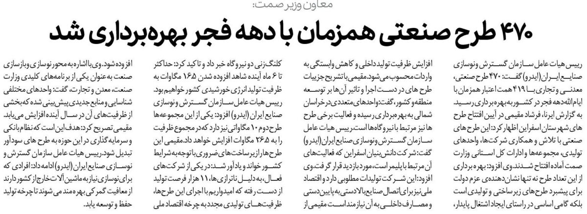رییس هیات عامل سازمان گسترش و نوسازی صنایع ایران (ایدرو) گفت: ۴۷۰ طرح صنعتی، معدنی و تجاری با ۴۱۹ همت اعتبار همزمان با ایام الله دهه فجر در کشور به بهره برداری رسید.به گزارش ایرنا، فرشاد مقیمی در آیین افتتاح طرح های شهرستان اسفراین اظهارکرد: این طرح های صنعتی با تلاش و همکاری شرکتها، واحدهای تولیدی، مجموعهها و ادارات کل استانی وزارت صمت آماده افتتاح شدند.وی افزود: بهره برداری از این تعداد طرح نه تنها نشاندهندهی عزم دولت برای پیشبرد طرحهای زیرساختی و تولیدی است بلکه گامی اساسی در راستای ایجاد اشتغال پایدار، افزایش ظرفیت تولید داخلی و کاهش وابستگی به واردات محسوب میشود.مقیمی با تشریح جزییات طرح های در دست اجرا و تاثیر آنها بر توسعه منطقه و کشور، گفت: واحدهای متعددی در خراسان شمالی به بهرهبرداری رسیده و فعالیت برخی طرح ها نیز مرتبط با نیروگاهها است.رییس هیات عامل سازمان گسترش و نوسازی صنایع ایران (ایدرو) گفت: شرکت دانشبنیان اسفراین که فعالیتهای آن مرتبط با پلیمر است، مورد بازدید قرار گرفت.وی افزود: این شرکت تولیدات مطلوبی دارد و اقتصاد ملی نیز برای اتصال صنایع بالادستی به پاییندستی و مصارف داخلی به آن نیازمند است مقیمی از کلنگزنی دو نیروگاه خبر داد و تاکید کرد: حداکثر تا ۶ ماه آینده شاهد افزوده شدن ۱۶.۵ مگاوات به ظرفیت تولید انرژی خورشیدی کشور خواهیم بود.رییس هیات عامل سازمان گسترش و نوسازی صنایع ایران (ایدرو) افزود: یکی از این مجموعهها طرح دوم ۱۰ مگاواتی نیز دارد که در مجموع ظرفیت را به ۲۶.۵ مگاوات افزایش خواهد داد.مقیمی این طرح ها را زیرساختهای ضروری با توجه به شرایط کشور خواند و یادآور شد: در یکی از شرکتهای فعال، به دلیل ناترازیها، ۱۱ هزار فرصت تولید از دست رفته که امیدواریم با اجرای این طرحها، ظرفیتهای تولیدی مجدد به چرخه اقتصاد ملی افزوده شود. وی با اشاره به محور نوسازی و بازسازی صنعت بهعنوان یکی از برنامههای کلیدی وزارت صنعت، معدن و تجارت، گفت: واحدهای مختلفی شناسایی و منابع جدیدی پیشبینی شده که بخشی از ظرفیتهای آن در سال آینده افزایش مییابد.مقیمی تصریح کرد: هدف این است که نظام بانکی و سرمایهگذاری در این حوزه به طرح های سودآور تبدیل شود.رییس هیات عامل سازمان گسترش و نوسازی صنایع ایران (ایدرو) ادامه داد: افرادی که برای نوسازی نیاز به ماشینآلات خارج از کشور دارند از معافیت گمرکی بهره مند می شوند تا چرخه تولید حفظ و توسعه یابد.