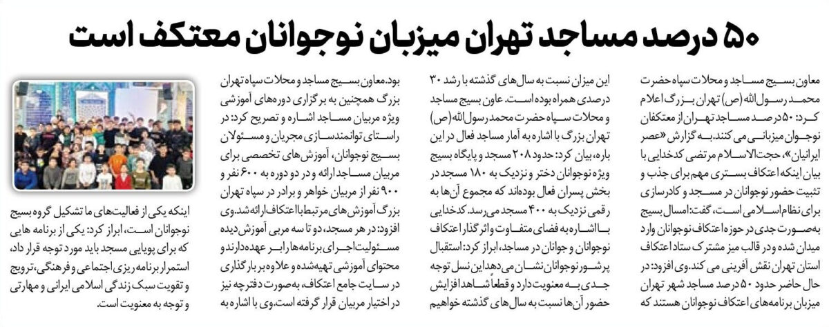 معاون بسیج مساجد و محلات سپاه حضرت محمد رسولالله (ص) تهران بزرگ اعلام کرد: ۵۰ درصد مساجد تهران از معتکفان نوجوان میزبانی میکنند. به گزارش «عصر ایرانیان»، حجتالاسلام مرتضی کدخدایی با بیان اینکه اعتکاف بستری مهم برای جذب و تثبیت حضور نوجوانان در مسجد و کادرسازی برای نظام اسلامی است، گفت: امسال بسیج بهصورت جدی در حوزه اعتکاف نوجوانان وارد میدان شده و در قالب میز مشترک ستاد اعتکاف استان تهران نقش آفرینی می کند.وی افزود: در حال حاضر حدود ۵۰ درصد مساجد شهر تهران میزبان برنامههای اعتکاف نوجوانان هستند که این میزان نسبت به سالهای گذشته با رشد ۳۰ درصدی همراه بوده است. عاون بسیج مساجد و محلات سپاه حضرت محمد رسولالله (ص) تهران بزرگ با اشاره به آمار مساجد فعال در این باره، بیان کرد: حدود ۲۰۸ مسجد و پایگاه بسیج ویژه نوجوانان دختر و نزدیک به ۱۸۰ مسجد در بخش پسران فعال بودهاند که مجموع آنها به رقمی نزدیک به ۴۰۰ مسجد میرسد.کدخدایی با اشاره به فضای متفاوت و اثرگذار اعتکاف نوجوانان و جوانان در مساجد، ابراز کرد: استقبال پرشور نوجوانان نشان میدهد این نسل توجه جدی به معنویت دارد و قطعاً شاهد افزایش حضور آنها نسبت به سالهای گذشته خواهیم بود.معاون بسیج مساجد و محلات سپاه تهران بزرگ همچنین به برگزاری دورههای آموزشی ویژه مربیان مساجد اشاره و تصریح کرد: در راستای توانمندسازی مجریان و مسئولان بسیج نوجوانان، آموزشهای تخصصی برای مربیان مساجد ارائه و در دو دوره به ۶۰۰ نفر و ۹۰۰ نفر از مربیان خواهر و برادر در سپاه تهران بزرگ آموزشهای مرتبط با اعتکاف ارائه شد.وی افزود: در هر مسجد، دو تا سه مربی آموزشدیده مسئولیت اجرای برنامهها را بر عهده دارند و محتوای آموزشی تهیهشده و علاوه بر بارگذاری در سایت جامع اعتکاف، بهصورت دفترچه نیز در اختیار مربیان قرار گرفته است.وی با اشاره به اینکه یکی از فعالیتهای ما تشکیل گروه بسیج نوجوانان است، ابراز کرد: یکی از برنامه هایی که برای پویایی مسجد باید مورد توجه قرار داد، استمرار برنامه ریزی اجتماعی و فرهنگی، ترویج و تقویت سبک زندگی اسلامی ایرانی و مهارتی و توجه به معنویت است.