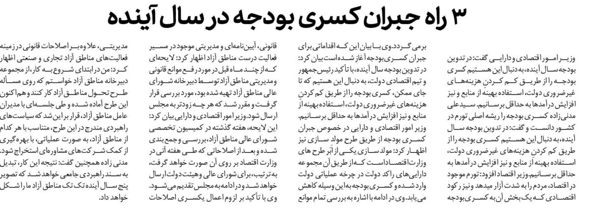 وزیر امور اقتصادی و دارایی گفت: در تدوین بودجه سال آینده، به دنبال این هستیم کسری بودجه را از طریق کم کردنِ هزینههای غیرضروری دولت، استفاده بهینه از منابع و نیز افزایش درآمدها به حداقل برسانیم. سیدعلی مدنیزاده کسری بودجه را ریشه اصلی تورم در کشور دانست و گفت: در تدوین بودجه سال آینده، به دنبال این هستیم کسری بودجه را از طریق کم کردنِ هزینههای غیرضروری دولت، استفاده بهینه از منابع و نیز افزایش درآمدها به حداقل برسانیم.وزیر اقتصاد افزود: تورم موجود در اقتصاد، مردم را به شدت آزار میدهد و نیز رکود اقتصادی که یک بخش آن به کسری بودجه برمیگردد.وی با بیان این که اقداماتی برای جبران کسری بودجه آغاز شده است بیان کرد: در تدوین بودجه سال آینده، با تأکید رئیسجمهور و تیم اقتصادی دولت، به دنبال این هستیم که تا جای ممکن، کسری بودجه را از طریق کم کردنِ هزینههای غیرضروری دولت، استفاده بهینه از منابع و نیز افزایش درآمدها به حداقل برسانیم.وزیر امور اقتصادی و دارایی در خصوص جبران کسری بودجه از طریق طرح مولد سازی نیز اظهار کرد: مولد سازی یکی از اَبَر طرح های وزارت اقتصاد است که از طریق آن مجموعه داراییهای راکد دولت در چرخه عملیاتی دولت وارد شده و کسری بودجه به این وسیله کاهش مییابد.وی در ادامه با اشاره به بررسی تمام موانع قانونی، آییننامهای و مدیریتی موجود در مسیر فعالیت درست مناطق آزاد اظهار کرد: لایحهای که از چند ماه قبل در مورد رفع موانع قانونی و مدیریتی مناطق آزاد توسط دبیرخانه شورای عالی مناطق آزاد تهیه شده بود، مورد بررسی قرار گرفت و مقرر شد که هر چه زودتر به مجلس ارسال شود.وزیر امور اقتصادی و دارایی بیان کرد: این لایحه، هفته گذشته در کمیسیون تخصصی شورای عالی مناطق آزاد، بررسی و جمع بندی شده و بعد از اصلاحاتی که طی هفته آتی در وزارت اقتصاد بر روی آن صورت خواهد گرفت، به ترتیب، برای شورای عالی و هیئت دولت ارسال خواهد شد و در ادامه به مجلس تقدیم میشود.وی با تأکید بر لزوم اعمال یکسری اصلاحات مدیریتی، علاوه بر اصلاحات قانونی در زمینه فعالیتهای مناطق آزاد تجاری و صنعتی اظهار کرد: من در ابتدای شروع به کار، از مجموعه دبیرخانه مناطق آزاد خواستم که روی مسأله طرح تحول مناطق آزاد کار کنند و هم اکنون این طرح آماده شده و طی جلسهای با مدیران عامل مناطق آزاد، قرار بر این شد که سیاستهای راهبردی مندرج در این طرح، متناسب با هر کدام از مناطق آزاد، به صورت عملیاتی، با بهرهگیری از کمک شرکتهای مشاورهای استخراج شود.مدنی زاده همچنین گفت: نتیجه این کار، تبدیل به سند راهبردی جامعی خواهد شد که تصویر پنج سال آینده تک تک مناطق آزاد ما را شکل خواهد داد.