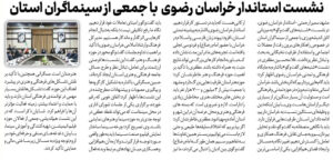 مشهد سمیرا رحمتی -استاندار خراسان رضوی، در نشست «شنبههای گفتوگو» به میزبانی اتاق اندیشهورزی با جمعی از سینماگران استان در خصوص راهکارهای برون رفت از معضلات اجتماعی و استفاده از ظرفیت نخبگانی به بحث و…