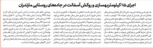 معاون فنی و راه های روستایی اداره کل راهداری و حمل و نقل جادهای استان مازندران از اجرای عملیات ۱۱۵ کیلومتر ساخت، بهسازی، نگهداری و روکش آسفالت در سطح محور های روستایی این استان با…