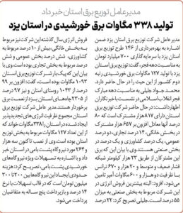 مدیرعامل شرکت توزیع برق استان یزد ضمن اشاره به بهرهبرداری از ۱۴۶ طرح توزیع برق استان یزد با سرمایهگذاری ۷۰۰ میلیارد تومان به مناسبت دهه فجر، گفت: توزیع برق استان یزد با تولید ۱۲۷ مگاوات…
