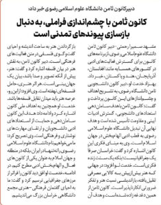 مشهد سمیرا رحمتی-دبیر کانون ثامن دانشگاه علوم اسلامی رضوی، از برنامههای کانون برای گسترش فعالیتهای ادبی در کشورهای همسایه مانند افغانستان، آذربایجان، هند و پاکستان، خبر داد. بهزاد خدمت لو، دبیر کانون دانشجویی ثامن دانشگاه…