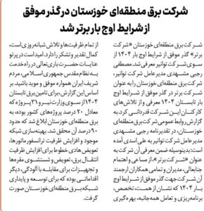 شرکت برق منطقهای خوزستان « شرکت برتر» گذر موفق از شرایط اوج بار ۱۴۰۴ از سوی شرکت توانیر معرفی شد. مصطفی رجبی مشهدی مدیرعامل شرکت توانیر، شرکت برق منطقهای خوزستان را به عنوان شرکت برتر…