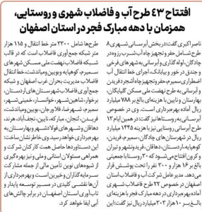 ناصر اکبری گفت: در بخش آبرسانی شهری 8 طرح شامل حفر و تجهیز چاه آب شرب رزوه در چادگان، لولهگذاری و آبرسانی به شهرهای فرخی و جندق در خور و بیابانک، اجرای خط انتقال آب…